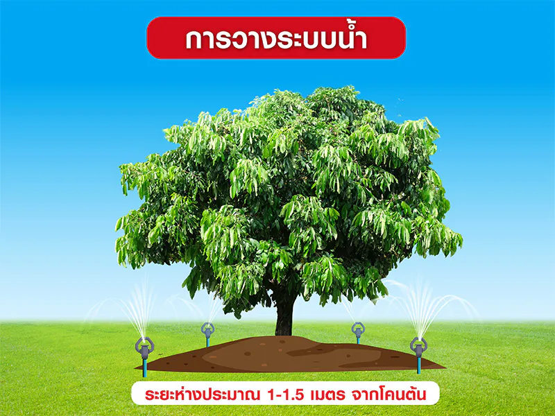 การวางระบบน้ำสปริงเกลอร์ 4 หัวต่อต้น ระยะห่าง 1-1.5 เมตร จากโคนต้นลำไย
