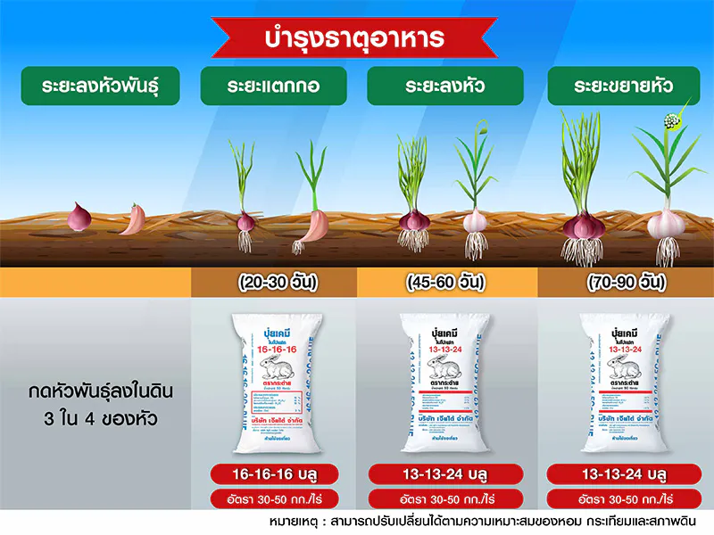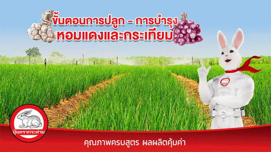 หอมแดงและกระเทียม เป็นพืชสมุนไพรที่นิยมนำมาเป็นวัตถุดิบในการประกอบอาหาร เพราะมีเอกลักษณ์โดดเด่นเฉพาะ คือ มีกลิ่นหอมฉุน นอกจากนี้มีการเพิ่มมูลค่าด้วยการแปรรูปผลผลิต อาทิ น้ำมันกระเทียม ผลิตภัณฑ์อาหารเสริม รวมถึงเวชสำอางที่ได้จากสารสกัดหอมแดง เนื่องจากหอมแดงและกระเทียมเจริญเติบโตได้ดีในพื้นที่อากาศเย็น จึงได้ความนิยมปลูก ช่วงเดือน พฤศจิกายน-กุมภาพันธ์ ข้อมูลจากระบบสารสนเทศการผลิตทางด้านการเกษตรกรมส่งเสริมการเกษตร กระทรวงเกษตรและสหกรณ์ ประจำปี 2565 ระบุว่าพื้นที่การเพาะปลูกหอมแดงและกระเทียม ครอบคลุมอยู่ในภาคเหนือและภาคอีสานของประเทศ โดยมีพื้นที่เพาะปลูกประมาณ 90,000 ไร่ทั่วประเทศ วันนี้ปุ๋ยตรากระต่ายขอแชร์ เคล็ดลับการการปลูกและการบำรุงหอมแดงและกระเทียม ให้หัวใหญ่ กลีบแน่น น้ำหนักดี มาฝากกันครับ