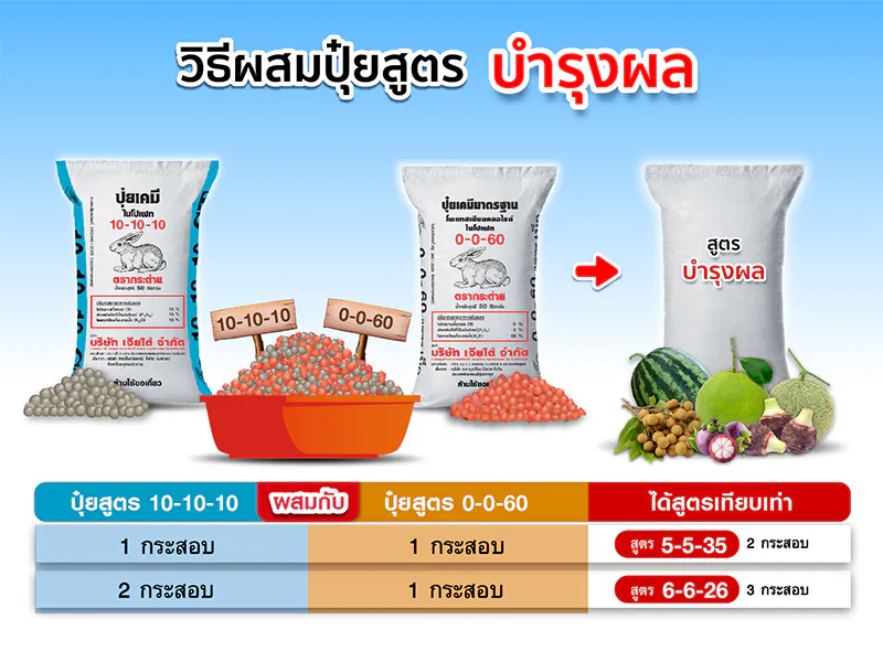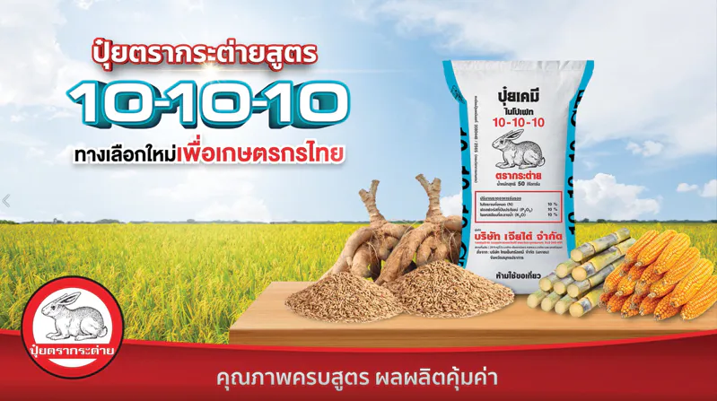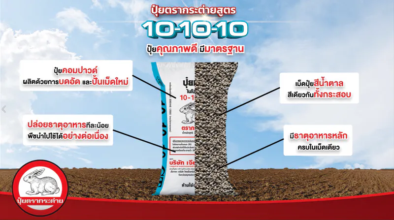 ปุ๋ยตรากระต่าย สูตร10-10-10 ทางเลือกใหม่เพื่อพี่น้องเกษตรกรไทย เป็นปุ๋ยคอมปาวด์ ที่มีธาตุอาหารหลักครบในเม็ดเดียว ได้แก่ ไนโตรเจน (N) ฟอสฟอรัส (P) และ โพแทสเซียม (K) โดยผ่านกระบวนการผลิตด้วยการบดอัดและปั้นเม็ดใหม่ที่ได้มาตรฐาน เม็ดปุ๋ยหว่านง่าย โดยจุดเด่นของปุ๋ยสูตรนี้ คือ มีไนโตรเจนอยู่ในรูปของ “แอมโมเนียม-ไนโตรเจน” เมื่อนำไปหว่าน จะปลดปล่อยธาตุอาหารทีละน้อยจนหมด พืชสามารถดูดซึมธาตุอาหารไปใช้ได้อย่างต่อเนื่อง