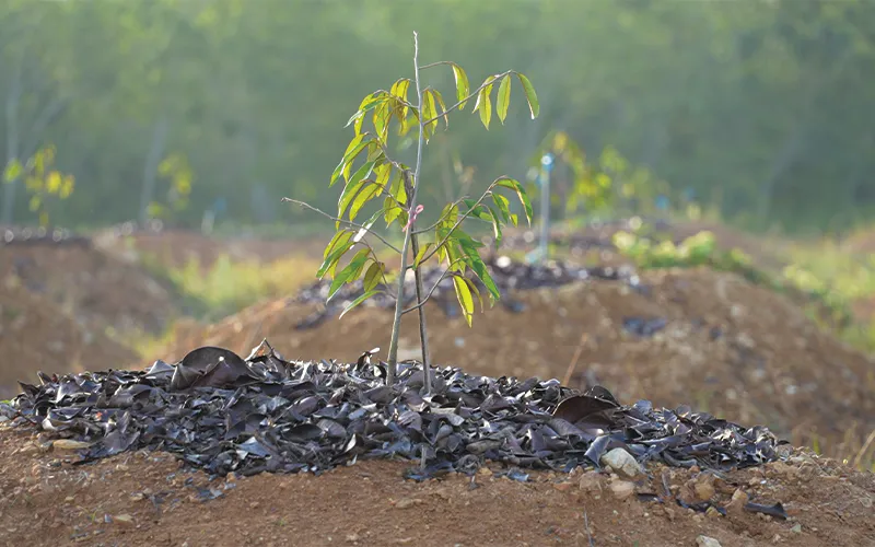 1. การปรับปรุงสภาพแปลงให้เหมาะสม เนื่องจากทุเรียนเป็นพืชที่ไม่ชอบน้ำท่วมขัง คุณนิสิน แนะนำว่า หากปลูกในพื้นที่ดอน ให้ศึกษาช่องทางการระบายน้ำภายในแปลงก่อน ถ้าบริเวณใดมีน้ำท่วมขัง ต้องทำทางน้ำไหลให้พร้อม หากปลูกในพื้นที่ลุ่ม หรือพื้นที่ฝนตกชุก ควรปลูกแบบ “นั่งแท่น หรือยกโคก” ให้ต้นอยู่สูงกว่าระดับดินปกติอย่างน้อย 0.8 - 1 เมตร เพื่อหลีกเลี่ยงน้ำท่วมขังราก