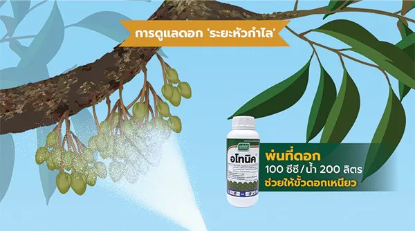 คุณนิสิน เผยว่า การปลูกทุเรียนให้ได้ผลผลิตเร็ว มีพื้นฐานตั้งแต่การคัดเลือกกิ่งพันธุ์ การบำรุงต้น-ใบให้สมบูรณ์ รวมถึงการตัดแต่งกิ่งให้อยู่ในสภาพเหมาะสมสำหรับการออกดอก ซึ่งช่วงที่เรียกได้ว่าเป็นหัวเลี้ยวหัวต่อเลยก็คือ “ช่วงติดดอก” เพราะเป็นตัวชี้วัดสำคัญว่าทุเรียนนั้นจะให้ผลผลิตได้มาก-น้อยแค่ไหน ยิ่งในระยะหลังนั้นมีปัญหาเรื่องสภาพอากาศที่แปรปรวน ก็ยิ่งส่งผลกับดอกทุเรียนโดยตรง หากเกษตรกรไม่สามารถดูแลได้อย่างเหมาะสม ดอกอาจจะร่วงหมดจนไม่เหลือให้ติดผลเลยก็ได้