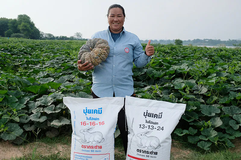 เริ่มจากหลังจากย้ายกล้าลงแปลงปลูกได้ประมาณ 15 วัน คุณลินดาจะเริ่มบำรุงด้วยปุ๋ยตรากระต่าย สูตร 16-16-16 บลู อัตรา 50 กิโลกรัมต่อไร่ เพื่อให้ต้นฟักทองที่ยังเล็กมีความแข็งแรง ใบหนาเขียวสมบูรณ์ สามารถสะสมอาหารได้ดี