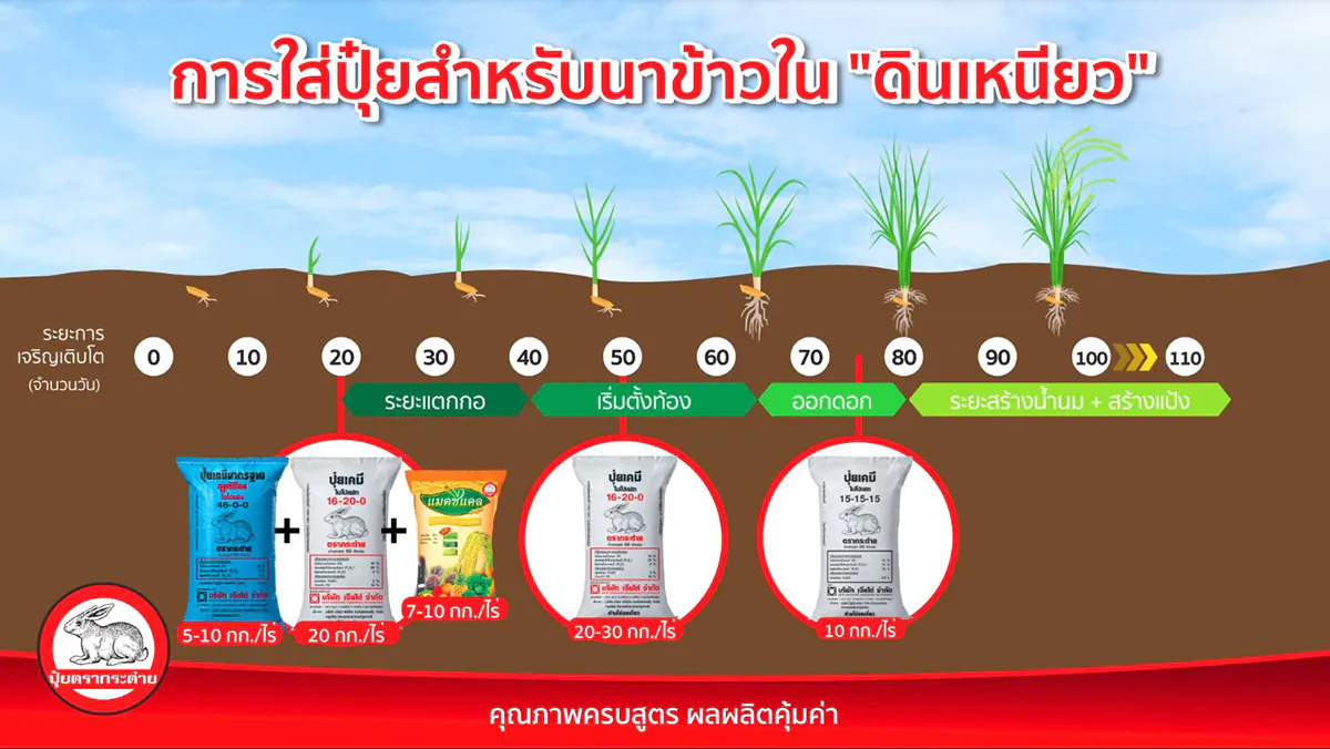 ทั้งนี้ การใส่ปุ๋ยสามารถเปลี่ยนแปลงได้ตามความเหมาะสม ขึ้นอยู่กับปัจจัยต่างๆ เช่น สภาพดินในแปลงปลูก พันธุ์ข้าว รวมถึงโรคและแมลงในแปลงปลูกด้วย