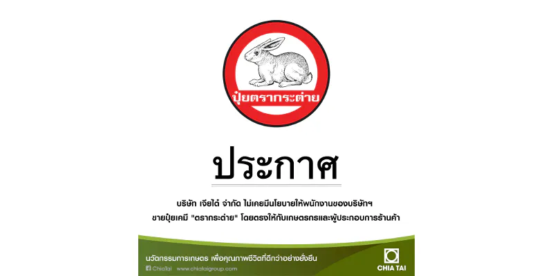บริษัท เจียไต๋ จำกัด ขอแจ้งให้ทราบอีกครั้งว่าทางบริษัทฯ ไม่เคยมีนโยบายให้พนักงานของเจียไต๋ขายปุ๋ยเคมี "ตรากระต่าย" โดยตรงให้กับเกษตรกรและผู้ประกอบการร้านค้า