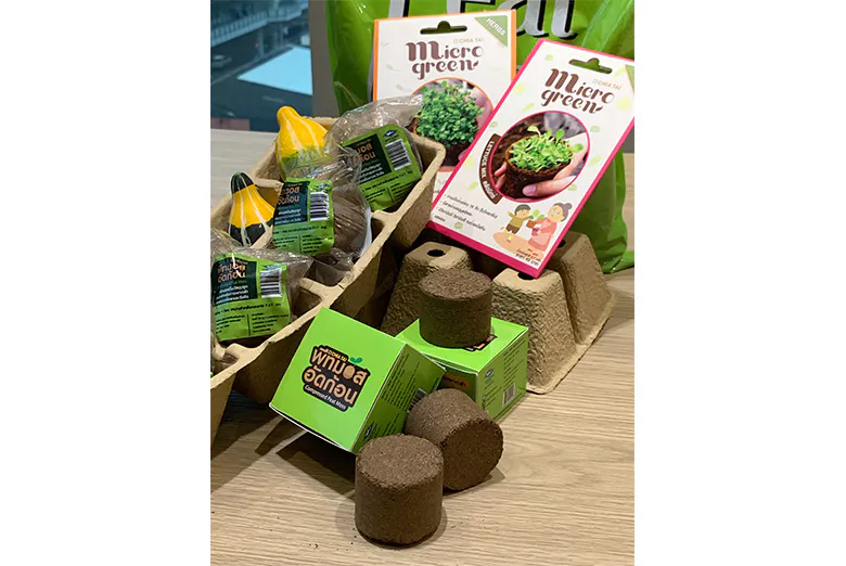 นอกจากการจัดมินิการ์เด้น เจียไต๋โฮมการ์เด้นยังนำพีทมอสมาใช้เป็นวัสดุปลูกในชุดสนุกปลูกที่วางจำหน่ายไปก่อนหน้านี้อีกด้วย เนื่องจากพีทมอสเป็นวัสดุปลูกคุณภาพที่ทุกคนสามารถใช้ได้อย่างง่ายดาย เพียงเติมน้ำ และรอเพียง 5 นาที พีทมอสจะพองตัวเป็นดินสำหรับเพาะกล้าพร้อมใช้งาน เหมาะสำหรับการเพาะเมล็ดและต้นกล้า ด้วยคุณสมบัติพิเศษจากซากพืชที่ทับถมกันมาเป็นเวลานาน ทำให้อุดมด้วยแร่ธาตุที่จำเป็นและเพียงพอต่อการเจริญเติบโตของพืช ทั้งยังสามารถเก็บความชื้น อุ้มน้ำและระบายน้ำได้ดี ปราศจากแมลง เชื้อโรค เชื้อรา และแบคทีเรีย ในขณะเดียวกันก็เป็นแหล่งที่อยู่ของแบคทีเรียชั้นดี ช่วยเพิ่มโอกาสการงอกของเมล็ด และทำให้ต้นกล้าสมบูรณ์แข็งแรง รวมถึงลดปัญหาการสลายตัวของธาตุอาหาร ด้วยคุณสมบัติที่สามารถเสริมแร่ธาตุให้กับพืชอย่างต่อเนื่อง นอกจากนี้ ยังสามารถนำไปใช้ร่วมกับดินชนิดต่างๆ เพื่อช่วยปรับดินให้มีประสิทธิภาพในการเพาะปลูกเพิ่มยิ่งขึ้น