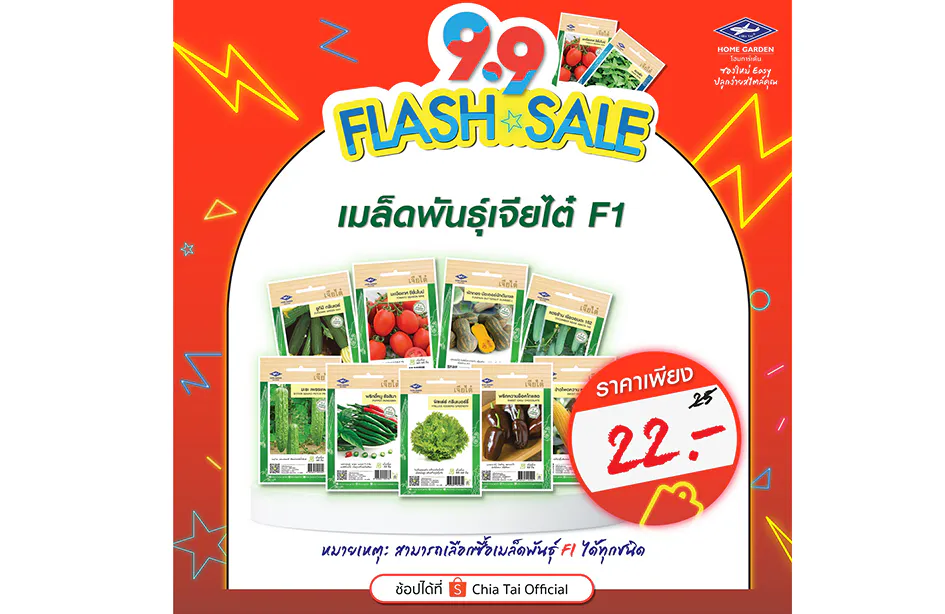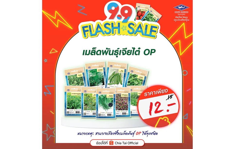 กรุงเทพฯ 8 กันยายน 2564 – เจียไต๋ โฮมการ์เด้น โดยกลุ่มบริษัทเจียไต๋ ผู้นำธุรกิจนวัตกรรมการเกษตรของไทย ส่งโปรโมชั่นเอาใจสายปลูกให้ช้อปสนุกถูกใจกว่าเคย ด้วยดีลเด็ดๆ ที่พลาดไม่ได้กับ Flash Sale 9.9 จัดขบวนสินค้ามาให้เลือกซื้อในราคาพิเศษ ไม่ว่าจะเป็นเมล็ดพืชผักสวนครัวสายพันธุ์ทั่วไป (OP) ที่ผลิตผลล้วนเป็นวัตถุดิบในจานโปรดของแทบทุกบ้าน เช่น กะเพรา ผักบุ้งจีน คะน้าฮ่องกง มะเขือเทศสีดา เป็นต้น ในราคาเพียงซองละ 12 บาท (จากราคาปกติ 15 บาท) หรือเมล็ดพันธุ์สายพันธุ์ลูกผสม (F1 Hybrid) ที่หลายคนชื่นชอบในรสชาติผลสด อย่างแตงกวา มินิคิวค์ ลิซ่า เมล่อน โกลเด้นควีน แตงโม สมูทตี้ ไร้เมล็ด มินิบร็อคโคลี รอยัล เป็นต้น ในราคาซองละ 22 บาท (จากราคาปกติ 25 บาท) และพลาดไม่ได้กับชุดปลูก “บำรุงกาย บำรุงใจ” เพียงชุดเดียวได้ครบ ลงมือปลูกได้ทันที ประกอบด้วยเมล็ดพันธุ์ผักที่ช่วยบำรุงร่างกายต้านโรคภัยจำนวน 6 ซอง ได้แก่ มะระขี้นก กะเพราแดง พริกขี้หนูสวน หอมแบ่ง ผักบุ้งจีนเรียวไผ่ และผักชี พร้อมด้วยวัสดุปลูกพีทมอสเจียไต๋ขนาด 5 ลิตร 1 ถุง ถาดเพาะกล้ารักษ์โลก 8 หลุม 6 ชิ้น และวัสดุปลูกซอยล์พลัสอีก 1 กิโลกรัม ในราคาสุดพิเศษ 179 บาท (จากราคาปกติ 219 บาท) เตรียมช้อปกันได้แล้วกับโปรโมชั่นเด็ดๆ ที่เจียไต๋ โฮมการ์เด้น ขนทัพสินค้าจัดเต็ม 2 วันโดนๆ เฉพาะวันที่ 9 กันยายน 2564 และ 15 กันยายน 2564 เท่านั้น