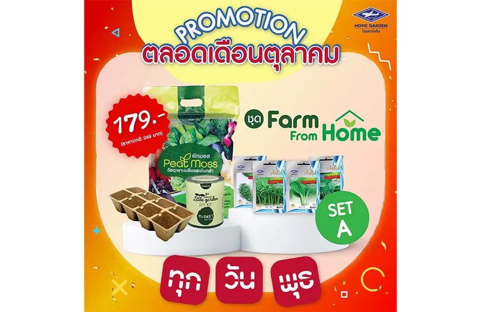 นอกจากนี้ ทุกวันพุธได้มีเฮกันตลอดทั้งเดือนตุลาคมนี้ เพราะเจียไต๋ โฮมการ์เด้น อยากชวนทุกคนมาสนุกกับการปลูกผักสวนครัวแบบง่ายๆ กันที่บ้าน ด้วยโปรโมชั่นชุดสนุกปลูก Farm From Home เซต A ลดราคาแบบจุกๆ เหลือ 179 บาท (จากปกติ 249 บาท) เอาใจมือใหม่ที่อยากเริ่มปลูกผัก ภายในชุดประกอบด้วยเมล็ดพันธุ์ผักบุ้งจีนเรียวไผ่ คะน้ายอด กวางตุ้งฮ่องเต้ เมล็ดพันธุ์ไควาเระ ชุดสนุกปลูกกะเพรา ถาดเพาะรักษ์โลก และวัสดุปลูกพีทมอส และพิเศษ เมื่อซื้อครบ 200 บาทขึ้นไป รับฟรี เมล็ดพันธุ์ซองจัมโบ้ จำนวน 1 ซอง (มูลค่า 40 บาท) ทุกการสั่งซื้อผ่านทาง Shopee ร้าน Chia Tai Official เท่านั้น อย่าพลาด กดสินค้าที่อยากได้เก็บลงตะกร้าไว้ก่อน แล้วมาซื้อกันได้ในวันพุธตลอดเดือนตุลาคมนี้
