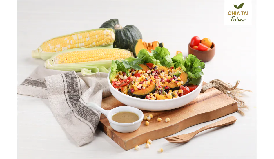 ในส่วนของสลัดทั้ง 2 รายการ นอกจากความอร่อยจากความสดใหม่ และความโดดเด่นด้านรสชาติของสายพันธุ์ข้าวโพดของเจียไต๋แล้ว เชฟเลือกใช้น้ำสลัดซิตรัส วีเนเกรท (citrus vinaigrette) ที่ให้ความเบา สดชื่นเมื่อรับประทานคู่กับผักสลัดและข้าวโพดย่าง จึงกลายเป็นมื้อแห่งความอร่อย ที่มาพร้อมสุขภาพอย่างแท้จริง นอกจากนั้นเจียไต๋ฟาร์มยังส่งเมนูสลัดไก่ย่าง ในสไตล์ South Western American ที่มีกลิ่นอายของอาหารเม็กซิกัน ที่เข้ากันได้ดีกับซัลซ่ามะเขือเทศ