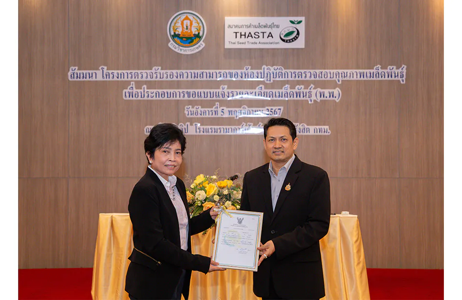 กรุงเทพฯ 12 พฤศจิการยน 2567 – เมื่อเร็วๆ นี้ บริษัท เจียไต๋ จำกัด ผู้นำธุรกิจนวัตกรรมการเกษตรของไทย นำโดย ดร. สุมิตรา กันตรง ผู้ช่วยกรรมการผู้จัดการ Strategic Partnership ธุรกิจเมล็ดพันธุ์ เข้ารับประกาศนียบัตร Q-Factory เมล็ดพันธุ์ ประจำปี 2567 จาก นายชัยศักดิ์ รินเกลื่อน ผู้อำนวยการสำนักควบคุมพันธุ์พืชและวัสดุการเกษตร เพื่อการันตีคุณภาพการผลิตเมล็ดพันธุ์เจียไต๋ และตอกย้ำความเป็นผู้นำธุรกิจเมล็ดพันธุ์คุณภาพสูงในไทย จัดโดยกรมวิชาการเกษตร ณ ห้องทิวลิป โรงแรมรามาการ์เด้นส์