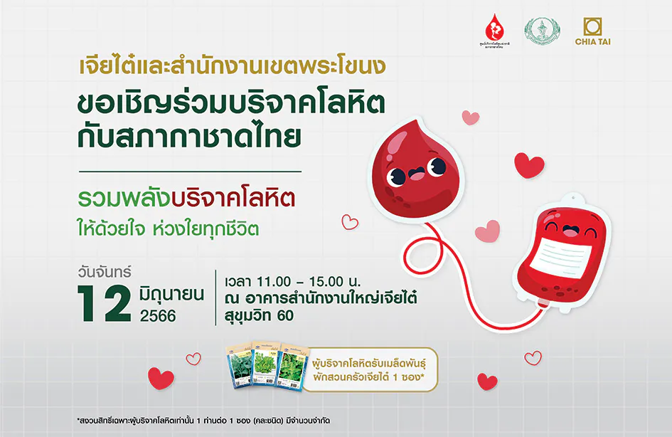 กรุงเทพฯ 22 พฤษภาคม 2566 – เนื่องในเดือนผู้บริจาคโลหิตโลกและเพื่อสำรองโลหิตให้เพียงพอต่อความต้องการ บริษัท เจียไต๋ จำกัด ผู้นำธุรกิจนวัตกรรมการเกษตรของไทย จับมือสภากาชาดไทยและสำนักงานเขตพระโขนง ขอเชิญชวนประชาชนรวมพลังบริจาคโลหิตในโครงการ “เจียไต๋อาสา ให้ด้วยใจ ห่วงใยทุกชีวิต” ครั้งที่ 2 พร้อมรับของที่ระลึกเมล็ดพันธุ์ผักสวนครัวเจียไต๋สำหรับผู้บริจาคโลหิต ในวันที่ 12 มิถุนายน พ.ศ. 2566 เวลา 11:00-15:00 น. ณ อาคารสำนักงานใหญ่เจียไต๋ สุขุมวิท 60