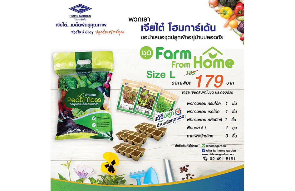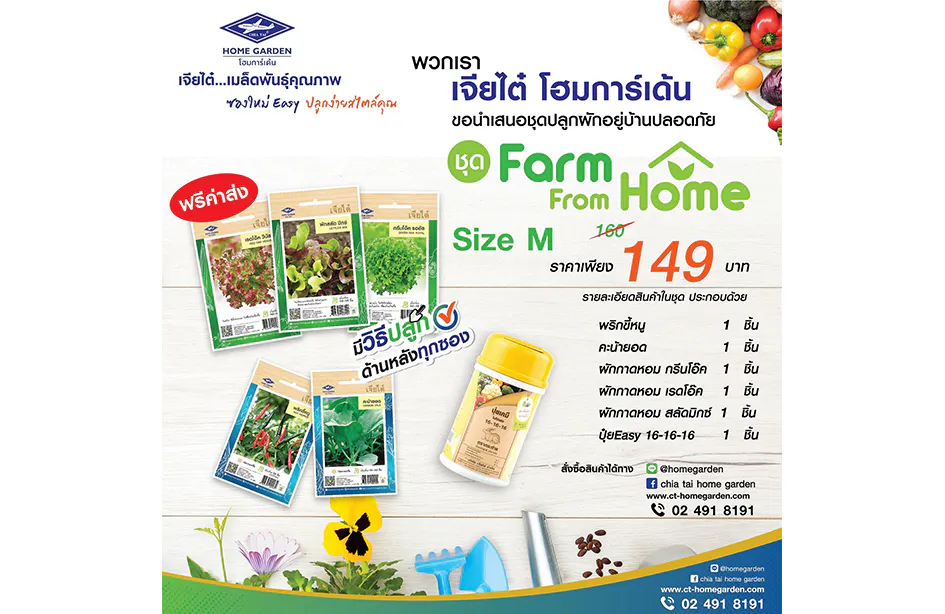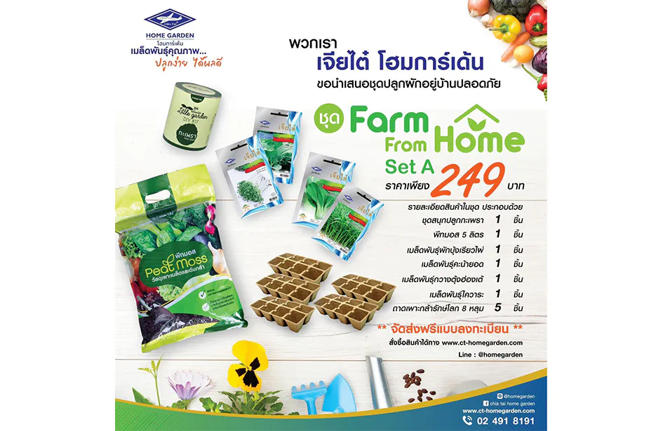 ชุดปลูกผักอยู่บ้านปลอดภัย Farm From Home นี้ ปลูกได้ง่ายโดยสามารถพลิกอ่านวิธีปลูกได้ที่ด้านหลังซองเมล็ดพันธุ์เจียไต๋ โฮมการ์เด้น ทั้งยังปลูกได้อย่างสะดวกสบายแม้ในพื้นที่จำกัดอย่างมุมเล็กๆ ของบ้าน อะพาร์ตเมนต์ หรือคอนโดมิเนียม ผู้ที่สนใจสามารถสอบถามข้อมูลเพิ่มเติมหรือสั่งซื้อ (พรีออเดอร์ 7-14 วัน) ได้ทาง www.ct-homegarden.com / Line : @homegarden / Facebook : Chia Tai Home Garden www.facebook.com/cthomegarden เพื่อให้การอยู่บ้าน ปลอดภัย ปลอดเชื้อ และยังเข้าถึงแหล่งอาหารพืชผักที่สดสะอาดที่ปลูกได้ด้วยตัวเอง สร้างความมั่นคงทางอาหารได้ในช่วงวิกฤตนี้