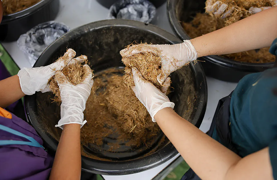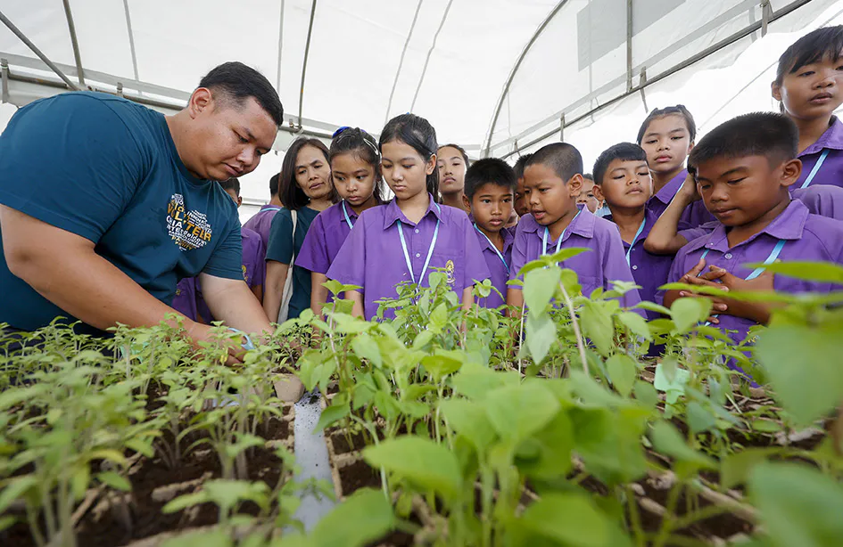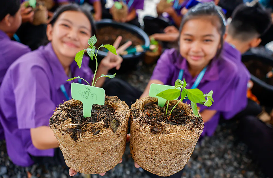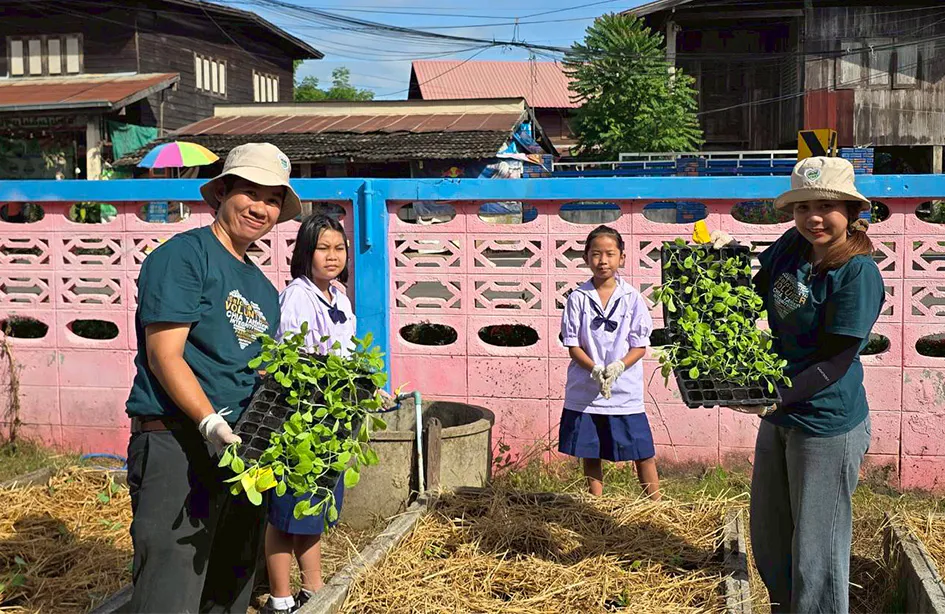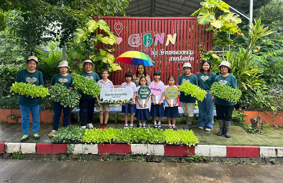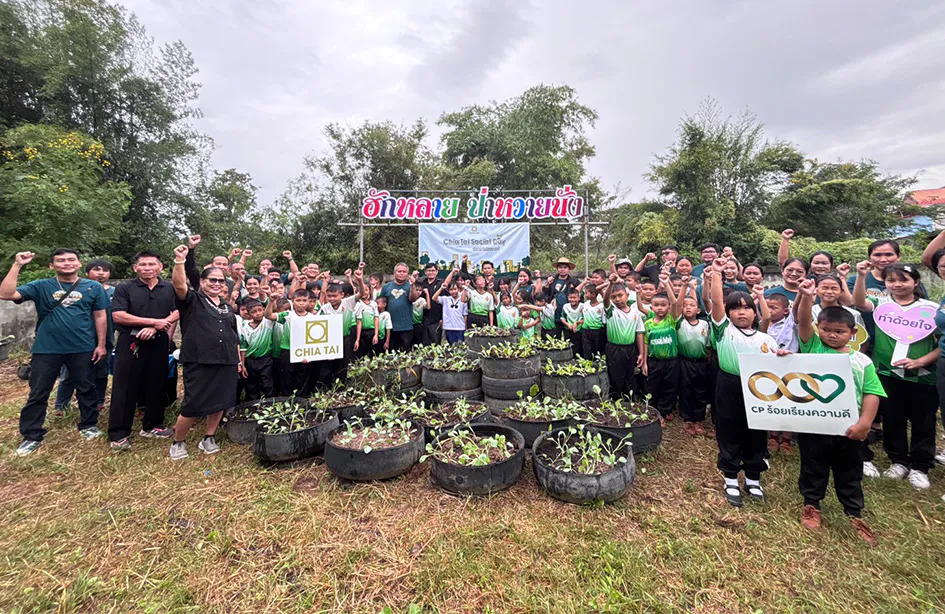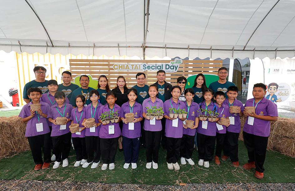 ต่อด้วยฐานที่ 2 “กระถางฟาง รักษ์โลก” ที่ทุกคนได้เรียนรู้ว่าฟางข้าวซึ่งเดิมที่มักถูกเผาทิ้งหรือไม่ได้ถูกนำมาใช้ประโยชน์ สามารถแปรรูปเป็นกระถางต้นไม้เป็นมิตรต่อสิ่งแวดล้อม ช่วยลดการปล่อยคาร์บอนฟุตพรินต์ และเป็นการคืนชีวิตใหม่ให้ทรัพยากรธรรมชาติ และปิดท้ายด้วยฐานที่ 3 “เพาะกล้า เติมยิ้ม” ที่น้องๆ นักเรียนและเจียไต๋อาสาร่วมกันเพาะกล้าจากเมล็ดพันธุ์คุณภาพจากเจียไต๋ อาทิ มะเขือเทศ กะเพรา โหระพา พริก และมะเขือ ก่อนนำลงปลูกในกระถางฟางข้าว เพื่อเรียนรู้การปลูกผักกินเองและนำความสุขกลับไปแบ่งปันที่บ้าน โดยทุกต้นกล้าที่ถูกเพาะในวันนี้ คือสัญลักษณ์ของการเริ่มต้นสิ่งดีๆ ที่กำลังเติบโตจากหัวใจของเจียไต๋อาสาทุกคน