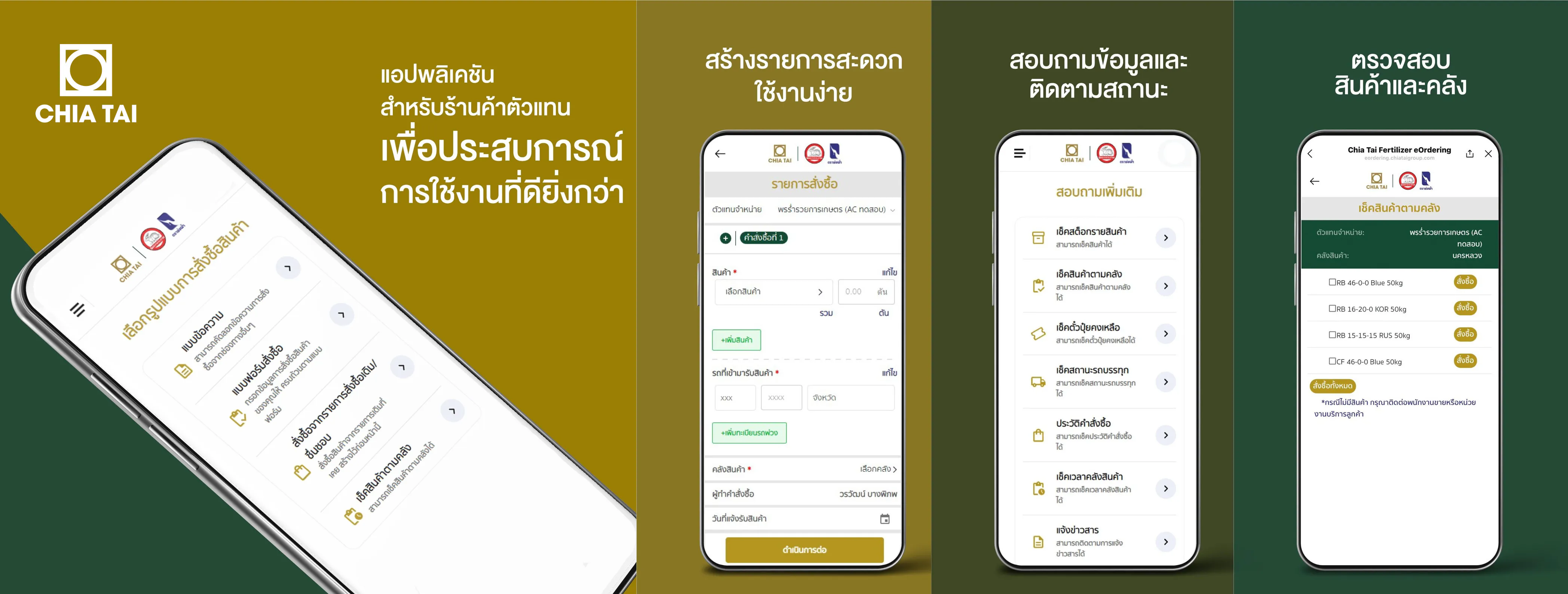 โดยแอปพลิเคชั่น eOrdering นี้ เจียไต๋พัฒนาขึ้นจากความตั้งใจที่จะยกระดับการบริการของเราให้ตอบโจทย์ความต้องการของลูกค้ายิ่งขึ้นผ่านเทคโนโลยีอัจริยะ จึงเกิดเป็นบริการดิจิทัลเพื่ออำนวยความสะดวกให้กับร้านค้าตัวแทนจำหน่ายของเจียไต๋ เพื่อแก้ไขปัญหาในขั้นตอนการสั่งซื้อและการตรวจสอบข้อมูลให้เป็นไปอย่างรวดเร็ว แม่นยำ และสะดวกสบายมากยิ่งขึ้น โดยมี 3 ฟีเจอร์สำคัญคือ การสั่งซื้อสินค้า การแก้ไขรายการสั่งซื้อสินค้า และการสอบถามข้อมูลต่างๆ เช่น ตรวจสอบสินค้า ตรวจสอบสถานะรถบรรทุก ตรวจสอบประวัติคำสั่งซื้อ พร้อมให้ลูกค้าใช้งานได้ตลอดเวลา” นายไพโรจน์ กล่าวปิดท้าย